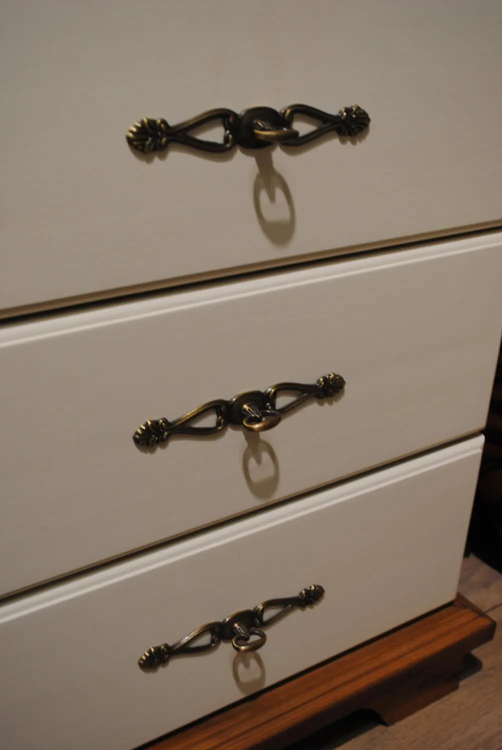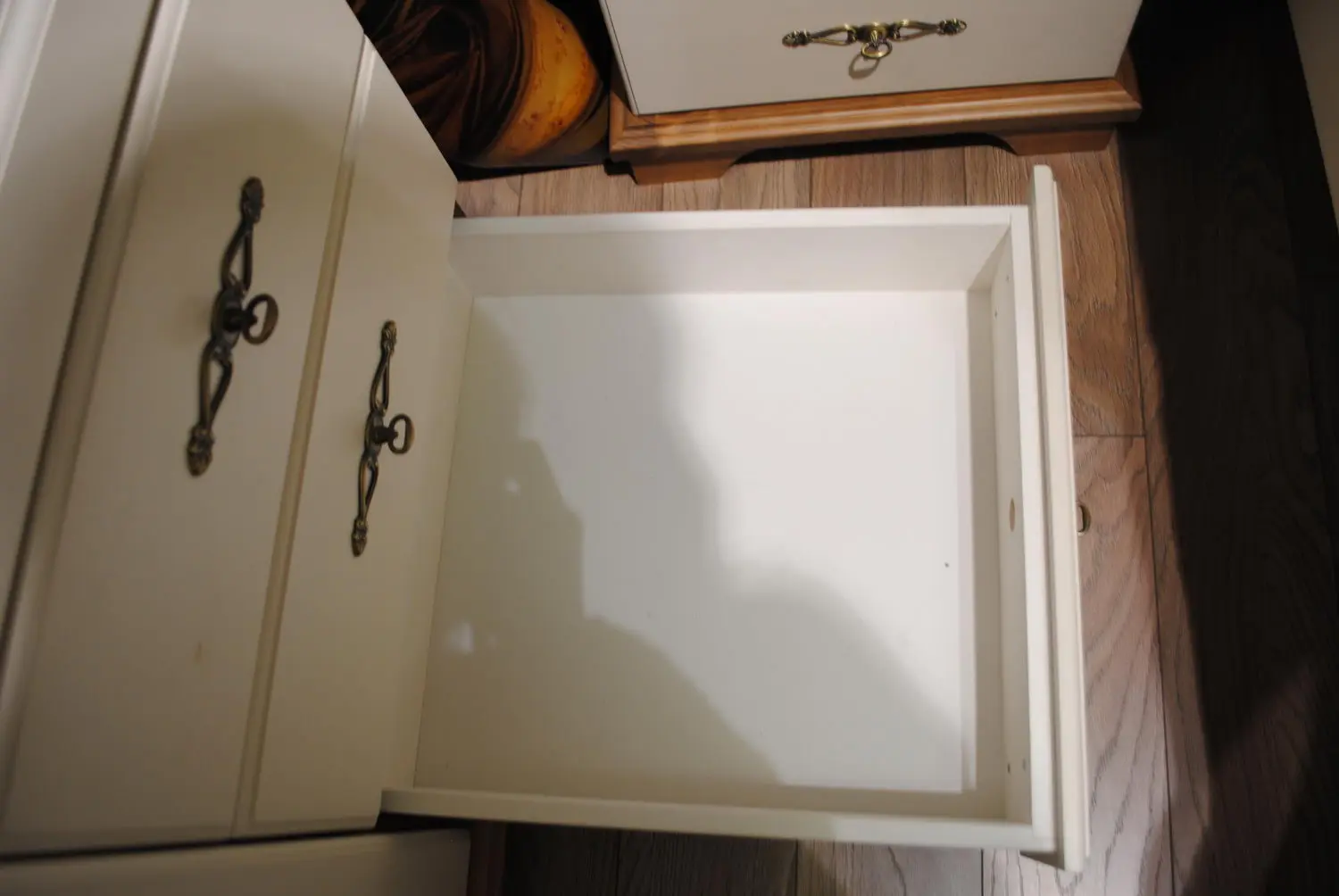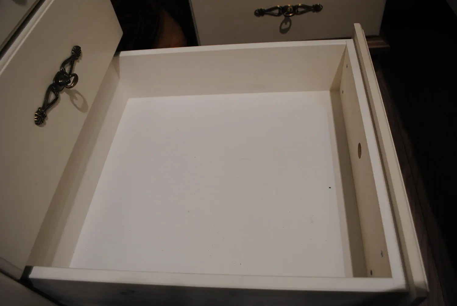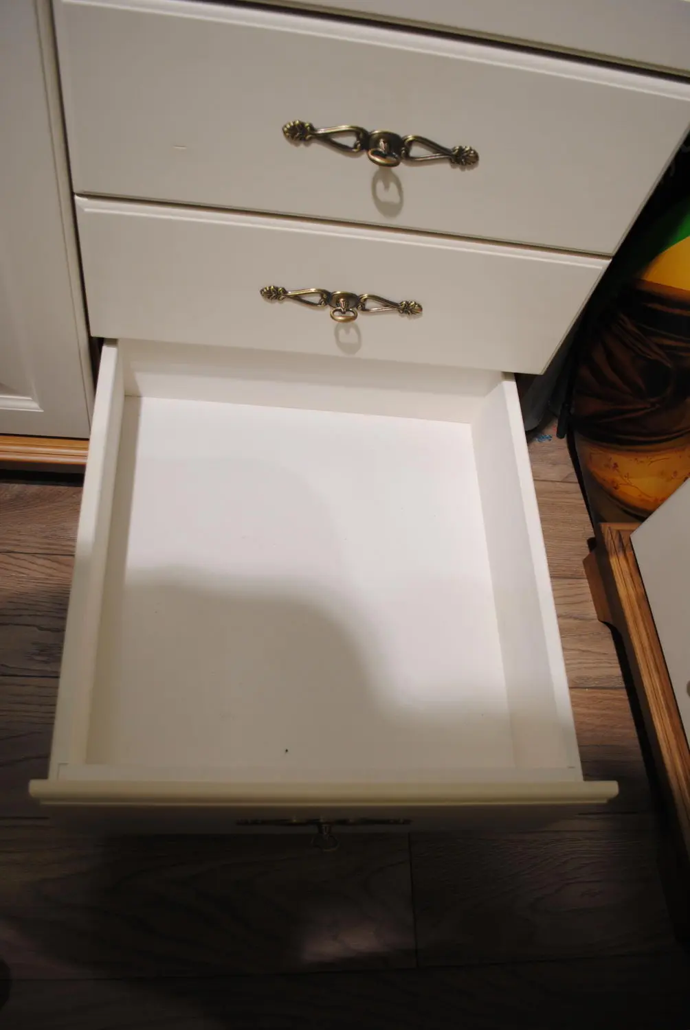 Внутренние боковины ящиков красятся в цвет лицевой панели. Задние стенки шкафа, а также дно ящиков, выполнены из белого двп.