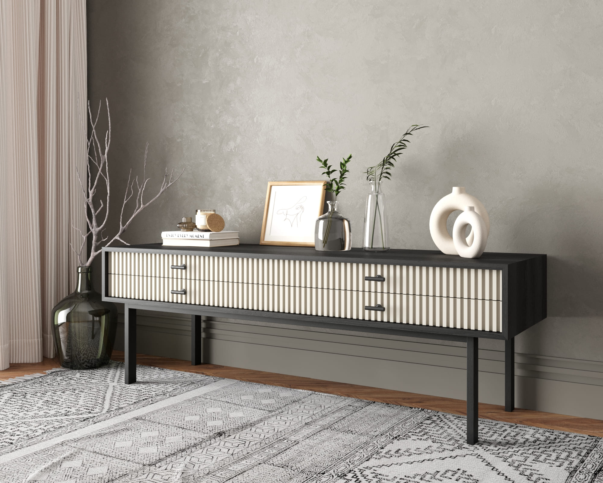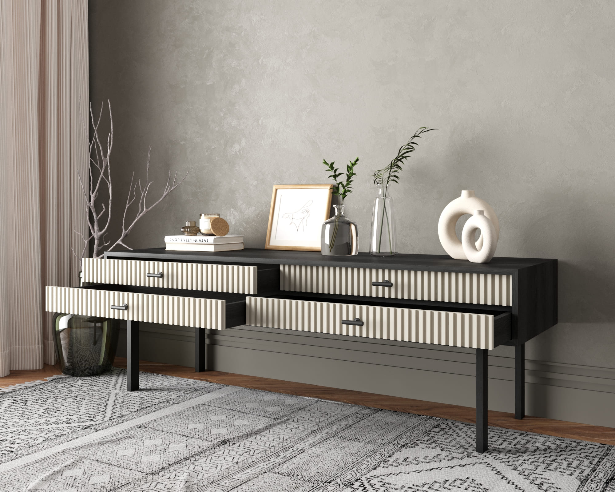 Эта консоль имеет металлические ручки, которые придают ей современный вид. Она может служить как туалетный стол или тумба под телевизор, что делает её универсальным решением для вашей комнаты.