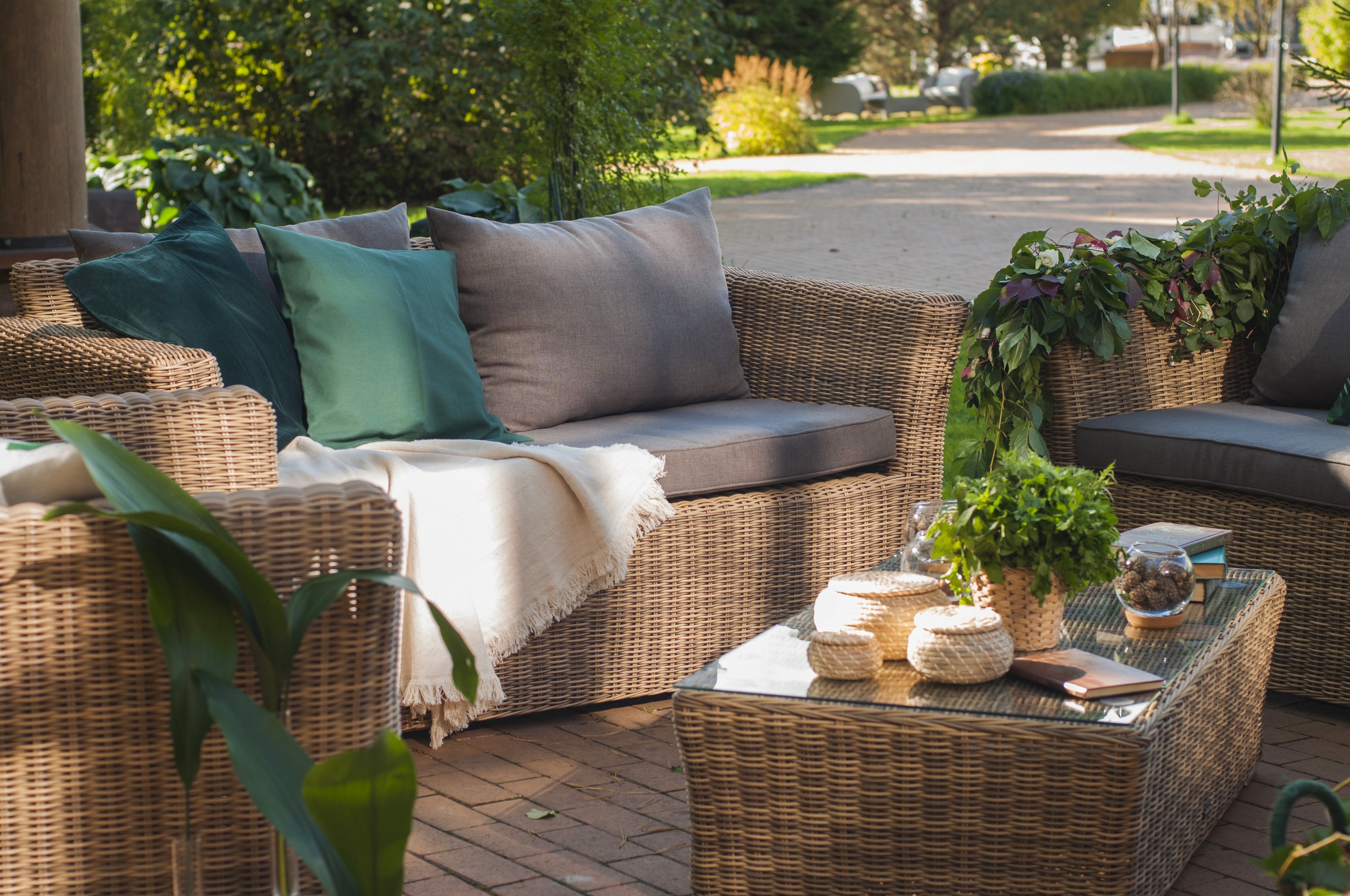 Лаунж-зона "Капуто Дабл" предназначена для размещения 7 персон. В ее комплектации находятся: - два кресла – 1050×850×810 мм - двухместный диван – 1700×850×810 мм - трехместный садовый диван – 2200×850×810 мм - плетеный журнальный столик – 1100×660×340 мм Прочность каркасу мебели обеспечивает алюминий. Из искусственного ротанга соломенного оттенка создана оригинальная ручная оплетка, которая выступает в качестве основного декора. Садовые диваны и кресла поставляются вместе с подушками. Они упакованы в съемные чехлы, которые при необходимости можно стирать. Для их производства берется полиэстер, плотность 230гр/м2. Материал защищен с помощью влагоотталкивающих составов. Цвет подушек – серо-коричневый. Столешница садового журнального столика создана из закаленного стекла. Его толщина составляет 5 мм. Крепится к плетеной поверхности с помощью вакуумных прозрачных присосок. "Капуто" кресло из искусственного ротанга, цвет соломенный 2шт. 1 040Х865Х815, "Капуто" журнальный столик из искусственного ротанга, цвет соломенный 1шт. 1 100Х660Х340, "Капуто" диван из искусственного ротанга трехместный, цвет соломенный 1шт. 2 220Х865Х815, "Капуто" диван из искусственного ротанга двухместный, цвет соломенный 1шт. 1 700Х865Х815,
