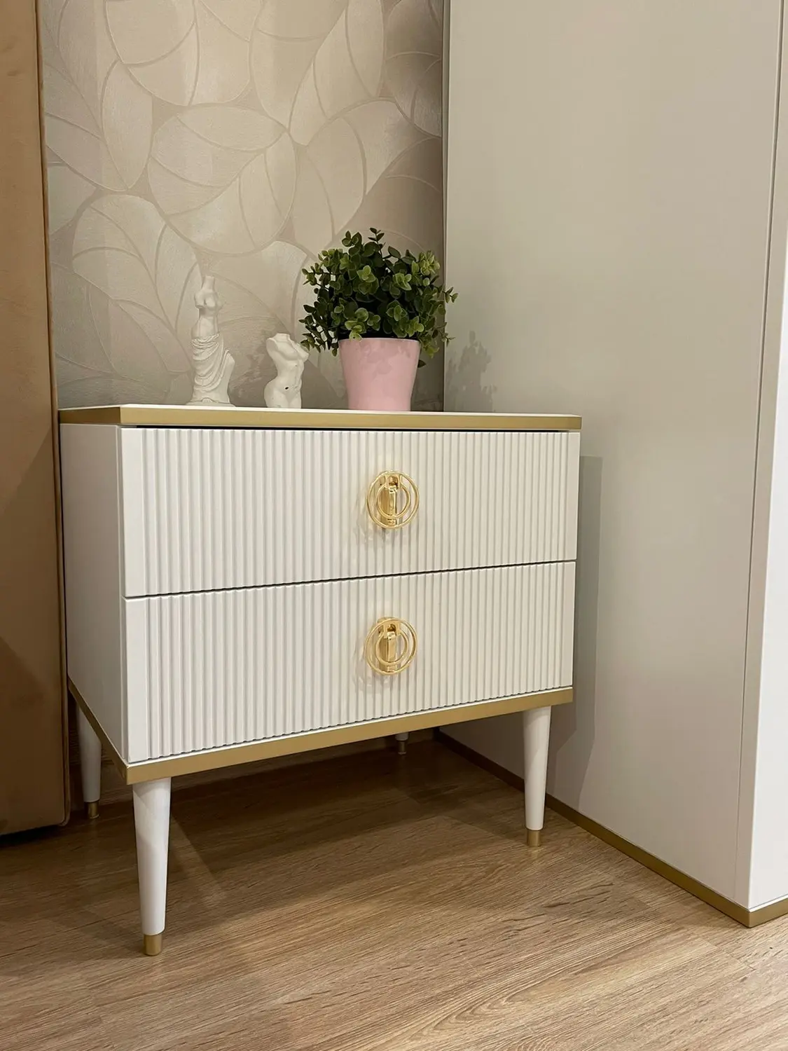 Фрезерованные фасады изящно сочетаются с металлическими ручками, ножки с золотой каймой завершают элегантный стиль модели.
